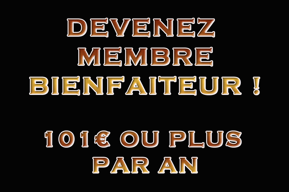 Afin de devenir Membre Bienfaiteur, vous devez cotiser lors de votre adhésion, une somme de votre choix strictement supérieur à 100 euros par chèque ou virement, voir plus haut. Dans ce cas comme le prévoit les statuts vous accéderez immédiatement au statut de "Membre Bienfaiteur". Notez que vous ne disposerez pas du livre-jeu physique offert pour la catégorie "Membre VIP", mais vous aurez toujours accès aux fichiers numériques proposés à l'ensemble des membres de l'association.