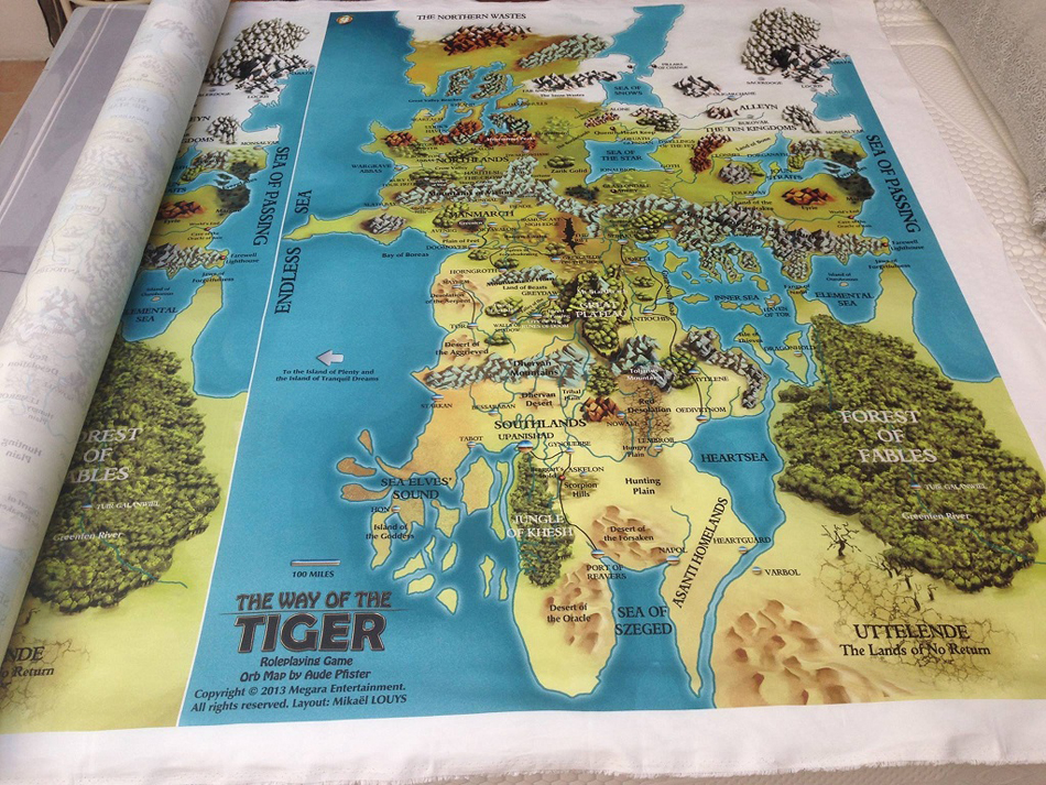 Carte en vo du monde d'Orb de la série La Voie du Tigre. Version géante de 1m en coton bio lavable. Fin de stock de notre partenaire Megara, seulement quelques unes de dispo. 50 euros. Prix net INCLUANT la livraison en colissimo suivi pour la France ou en colis normal pour l'étranger. Paiement uniquement par virement bancaire ou par chèque à l'ordre de Brocéliande Éditions et à envoyer à : Brocéliande Éditions, Chez Louys, 6a rue Merle, 06400 Cannes, France.